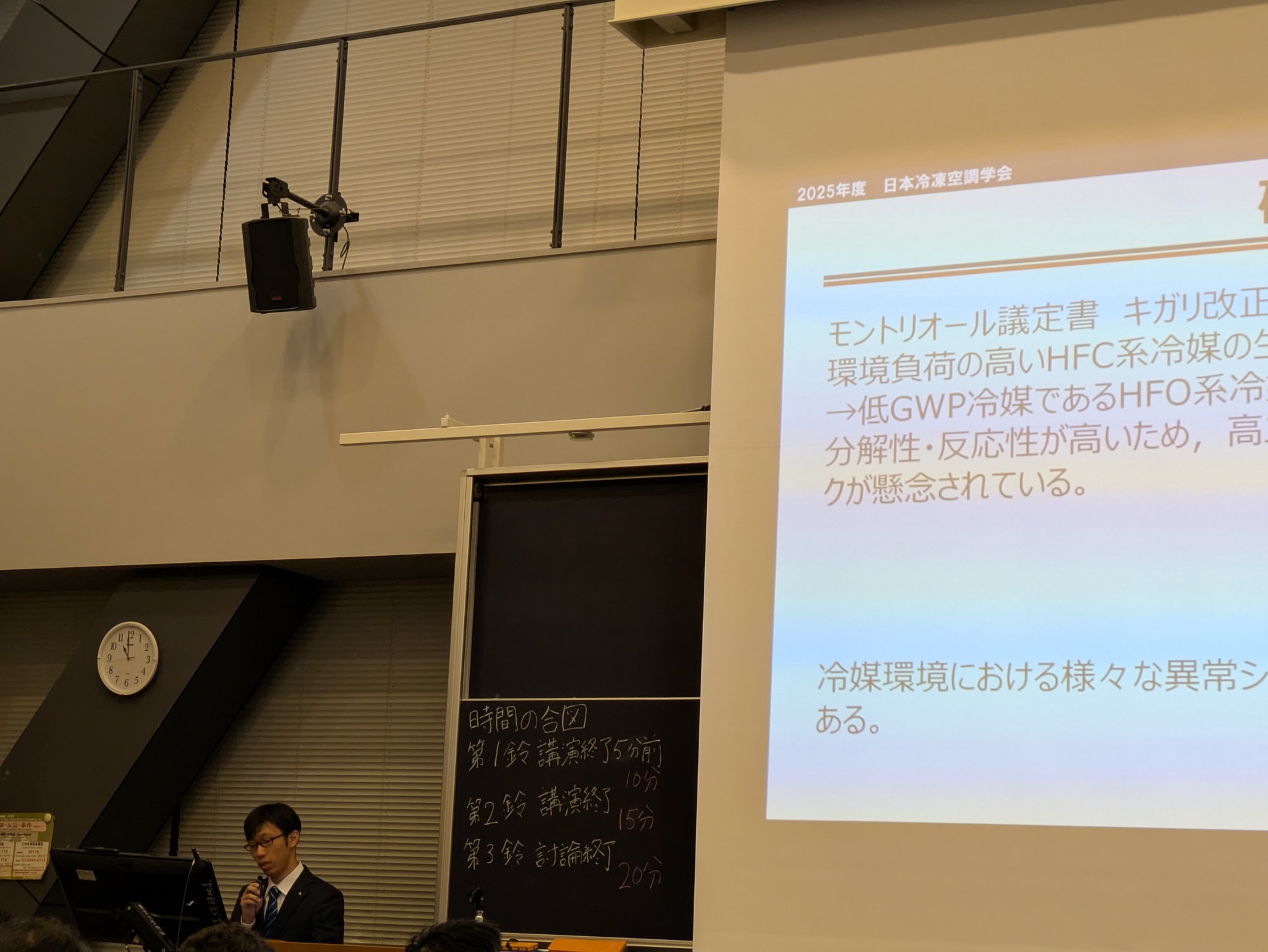 2025/9/10に東京大学で開催された2025年度日本冷凍空調学会年次大会において,M1の髙木くんが「家庭用冷凍空調機圧縮機内で生じうるアーク放電のエネルギー評価」と題した発表を行いました。地球環境保護のためにより地球温暖化係数(GWP)の低い冷媒の開発とその実装に向けた取り組みが進んでいますが,そのような冷媒の中にはある特定の条件がそろうと,酸素がなくとも爆発的な自己分解を起こすものがあります。そこで,エアコン実機内で何らかの異常(例えばショート)が起きたときに,どのくらいのエネルギーになるのか?ということを調べています。学会発表デビュー戦でしたが堂々と発表できました!