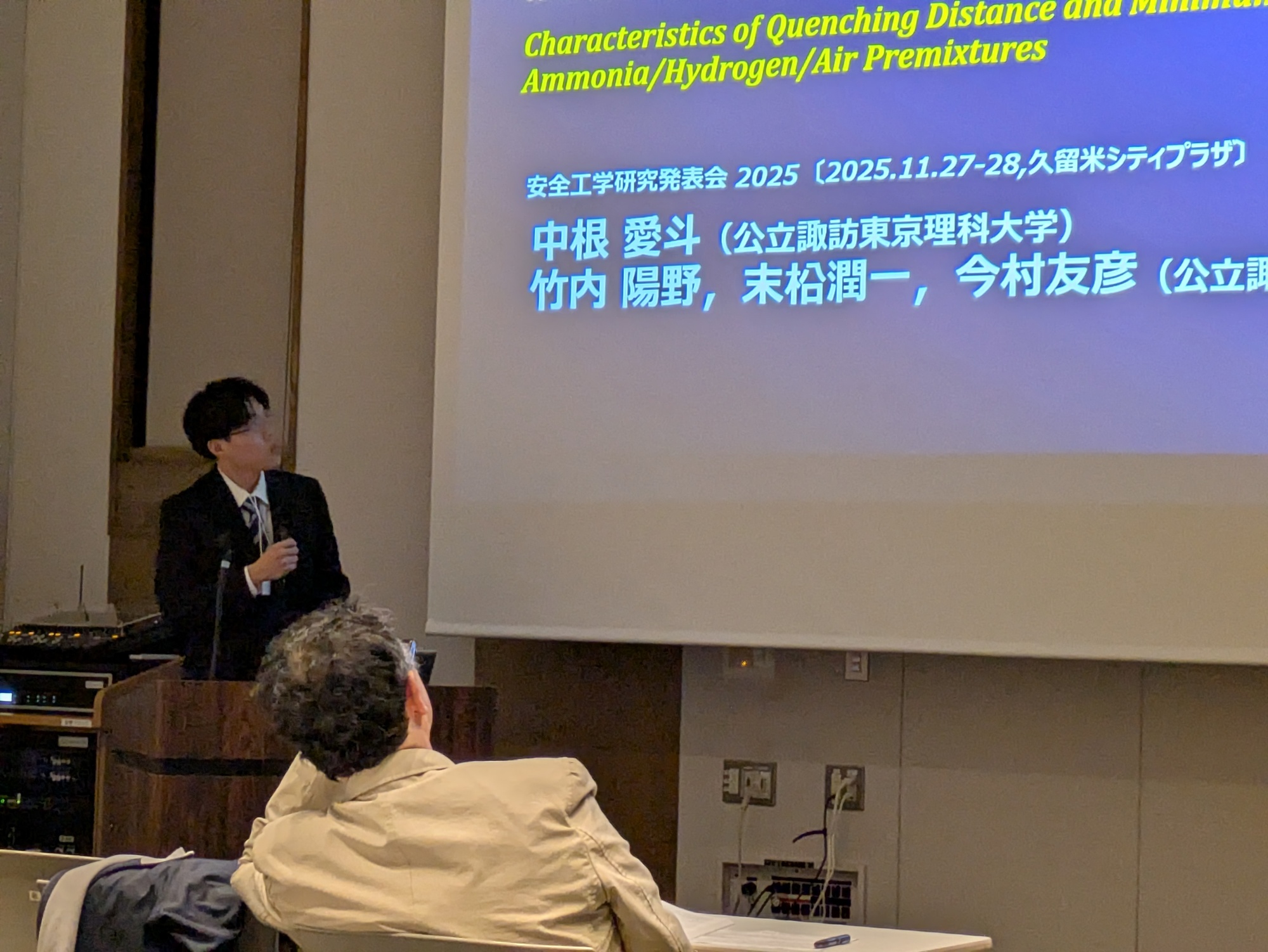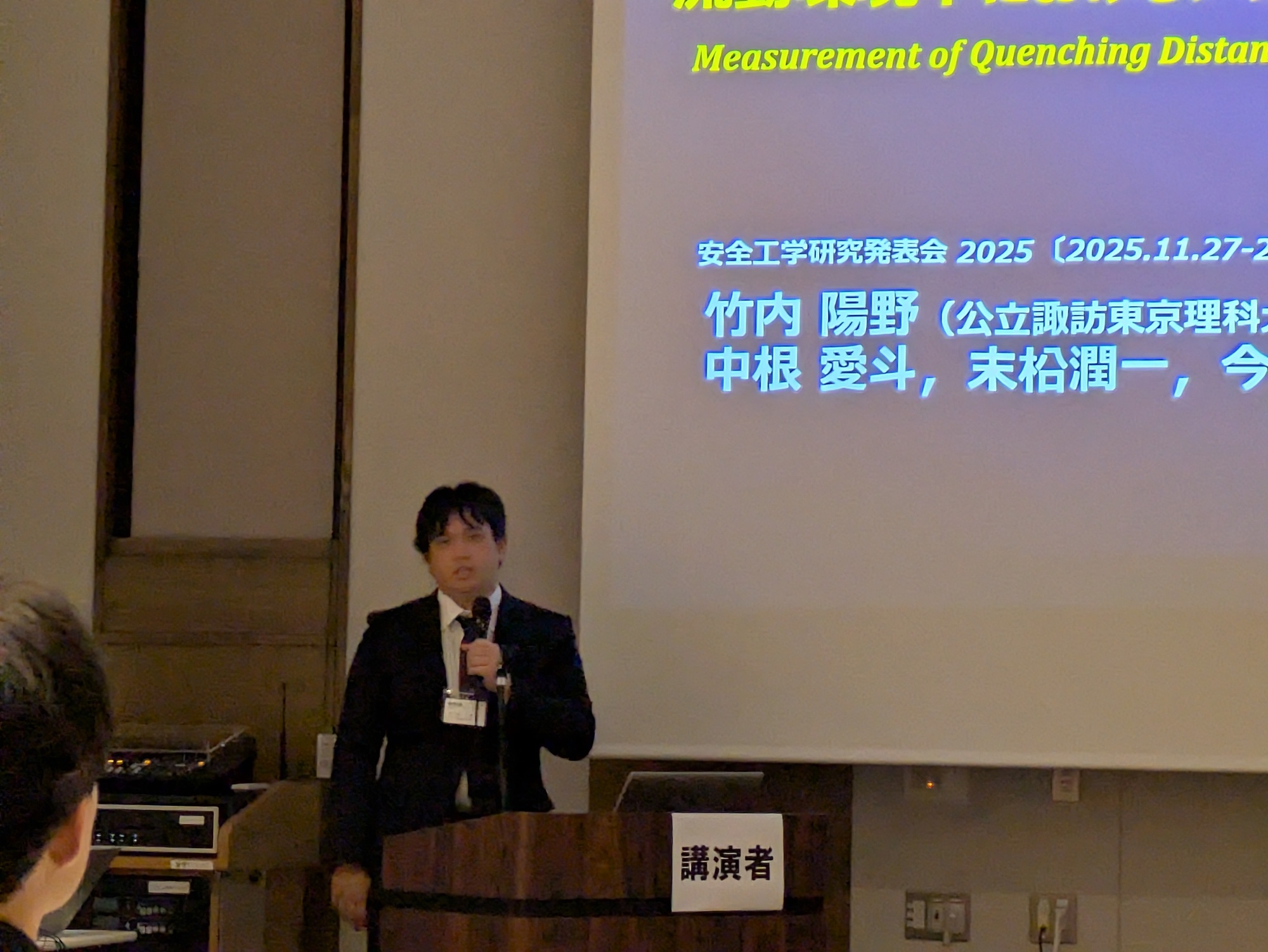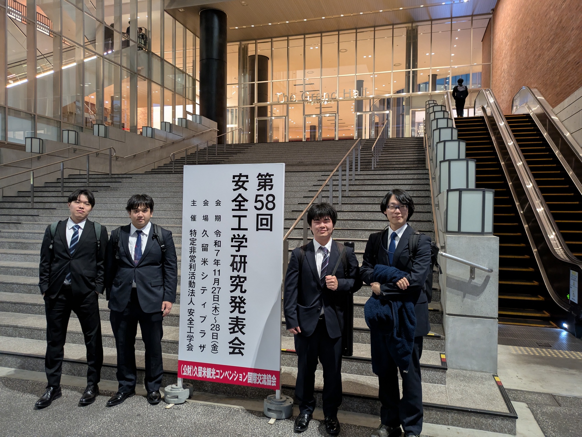 安全工学研究発表会は本研究室における主要な研究成果発表の場の1つです。今年は2025/11/27・28に福岡県久留米市で開催されました。当研究室からは口頭発表3件,ポスター発表1件の計4件の発表を行いました。今村は実行委員として座長やその他の会議運営を担当していました。会議の後は他大学と交流ということで餃子パーティー!大変有意義な時間でした。